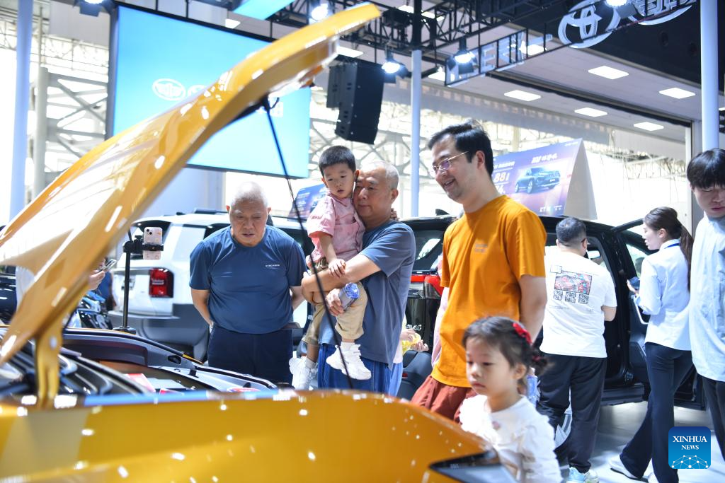 Visitors view a car displayed at an automobile consumption promotion event held in Changsha, central China's Hunan Province, Oct. 1, 2025. The event kicked off at Hunan International Convention and Exhibition Center on Wednesday with an aim to activate the vitality of the automotive consumption market. (Xinhua/Ding Chunyu)