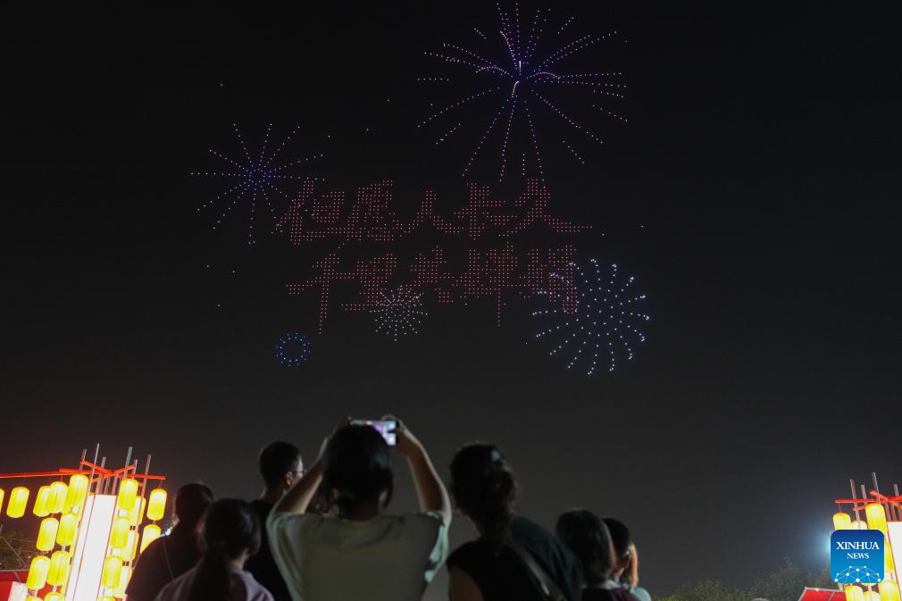 People enjoy a drone light show in Shaoxing, east China's Zhejiang Province, Oct. 1, 2025. This year, with China's Mid-Autumn Festival falling alongside National Day, an eight-day holiday starting Wednesday is set to energize local economies through a surge in cultural tourism. (Xinhua/Huang Zongzhi)