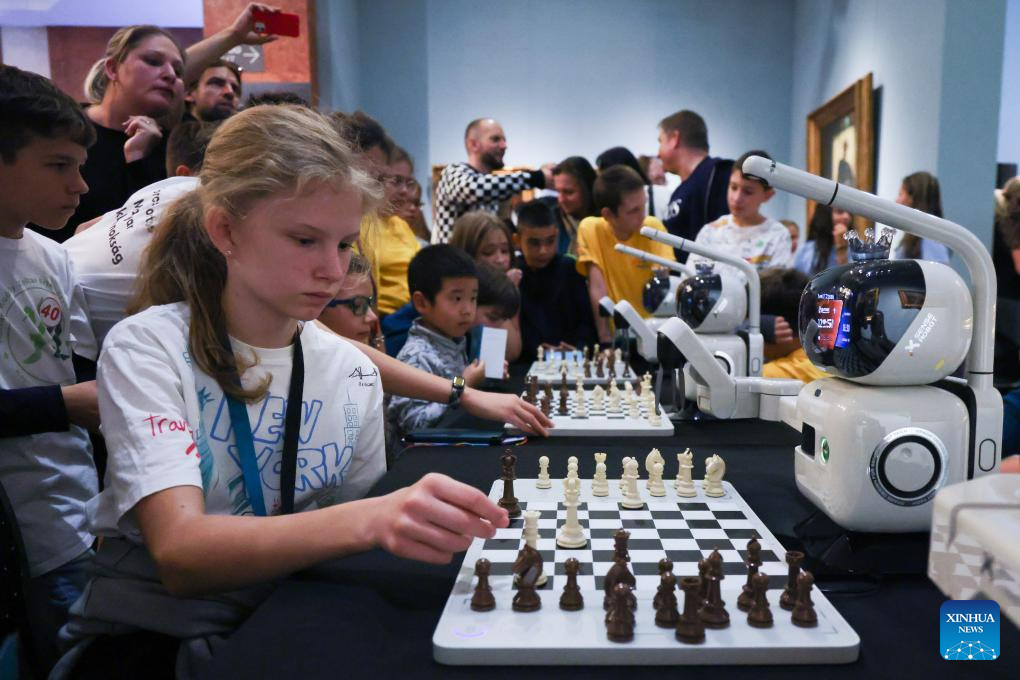 Children play with a chess robot at the Global Chess Festival in Budapest, Hungary, on Sept. 30, 2025. The Hungarian National Gallery turned into a vibrant space of intellect and imagination for children here on Tuesday as the 11th Judit Polgar Global Chess Festival drew thousands of visitors. (Photo by Attila Volgyi/Xinhua)