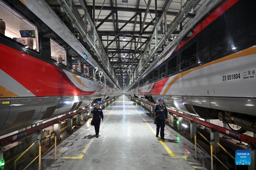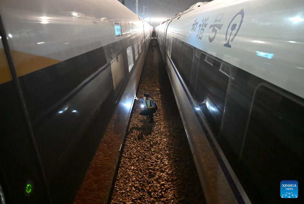 A mechanist checks bullet trains in Zhengzhou, central China's Henan Province, Oct. 1, 2025. To ensure transport capacity during the National Day and Mid-Autumn Festival holiday, the Zhengzhou bureau of China State Railway Group Co., Ltd. adjusted its maintenance plans for bullet trains to maximize the available operational rate of trains. Zhengzhou section planned to put 2,193 bullet trains into operation during the holiday. (Xinhua/Li Jianan)