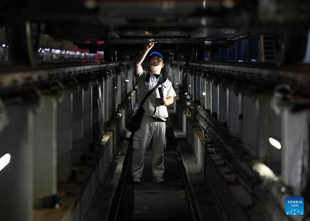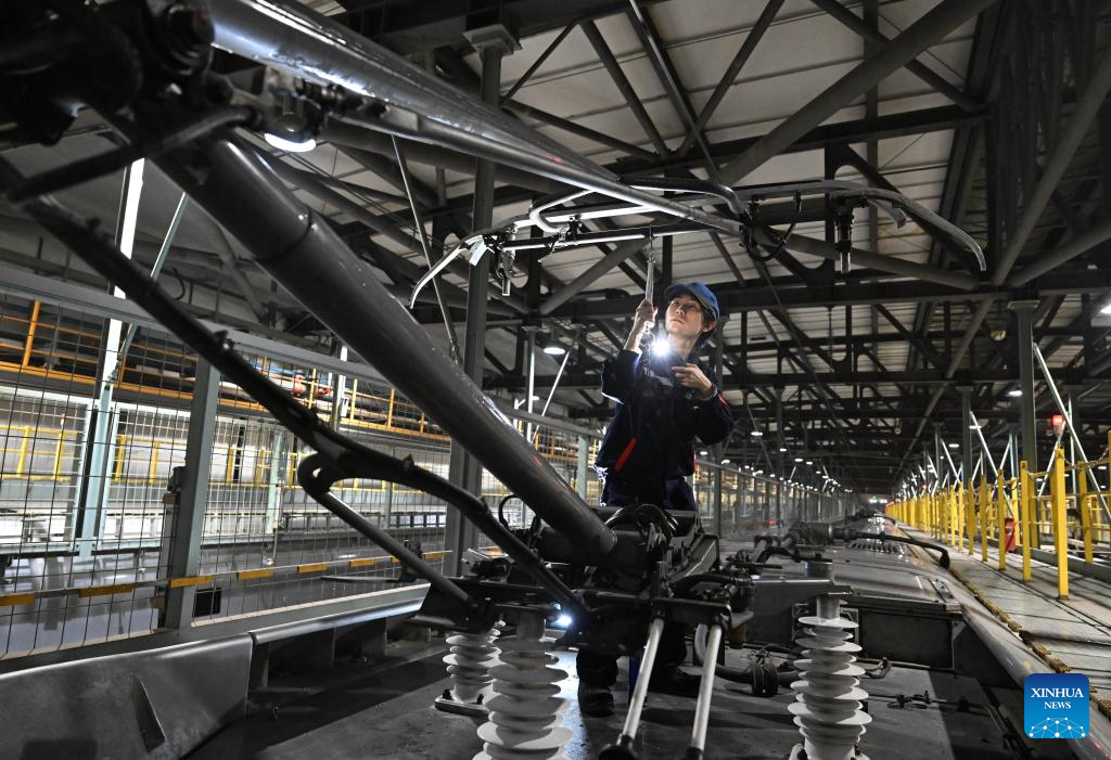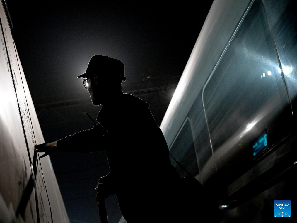 A mechanist checks a bullet train in Zhengzhou, central China's Henan Province, Oct. 1, 2025. To ensure transport capacity during the National Day and Mid-Autumn Festival holiday, the Zhengzhou bureau of China State Railway Group Co., Ltd. adjusted its maintenance plans for bullet trains to maximize the available operational rate of trains. Zhengzhou section planned to put 2,193 bullet trains into operation during the holiday. (Xinhua/Li Jianan)