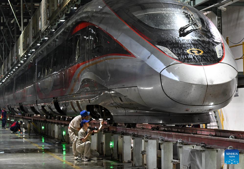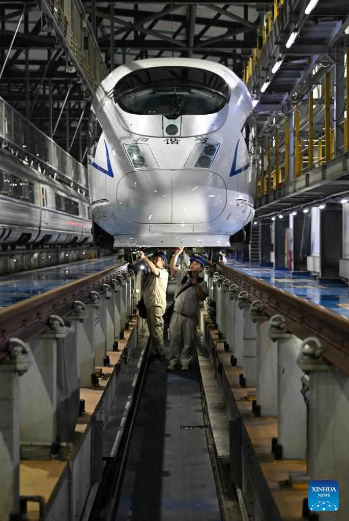 Mechanists check a bullet train in Zhengzhou, central China's Henan Province, Sept. 30, 2025. To ensure transport capacity during the National Day and Mid-Autumn Festival holiday, the Zhengzhou bureau of China State Railway Group Co., Ltd. adjusted its maintenance plans for bullet trains to maximize the available operational rate of trains. Zhengzhou section planned to put 2,193 bullet trains into operation during the holiday. (Xinhua/Li Jianan)