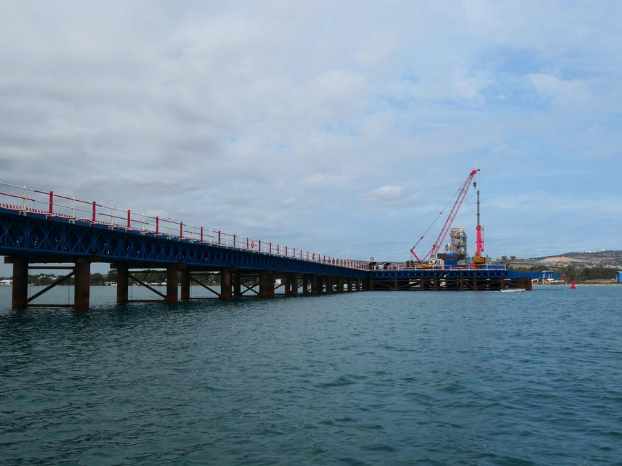 At the site, concrete pillars rise from both banks as two steel trestles extend dozens of meters into the canal. Chinese and Tunisian workers are operating cranes and welding equipment in coordinated rhythm, with foundation work already 14 percent complete.