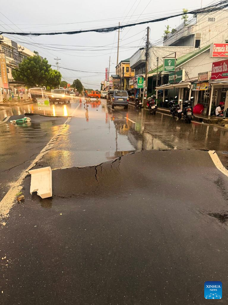 Large cracks are seen on a road after a 6.9-magnitude earthquake shook Cebu province, the Philippines, on Oct. 1, 2025. At least 26 people were killed and 147 others were injured as an offshore 6.9-magnitude earthquake hit Cebu province in the central Philippines on Tuesday night, the Philippines' National Disaster Risk Reduction and Management Council reported on Wednesday.