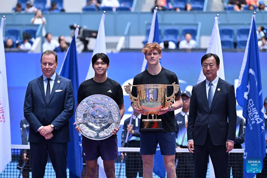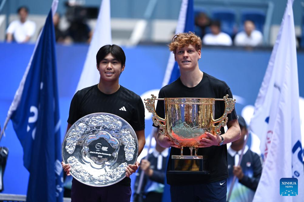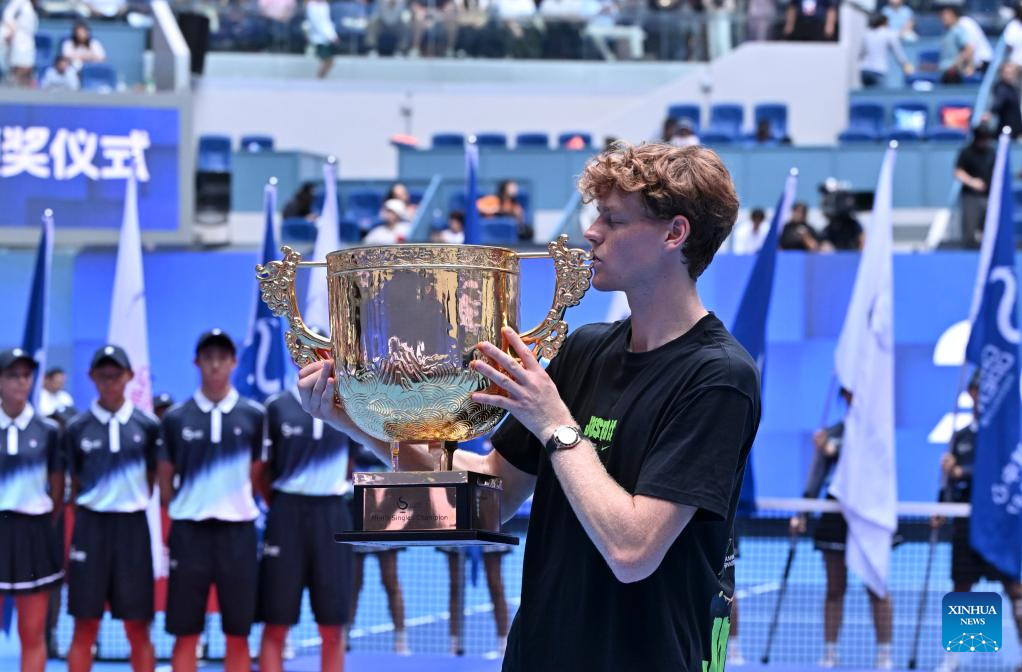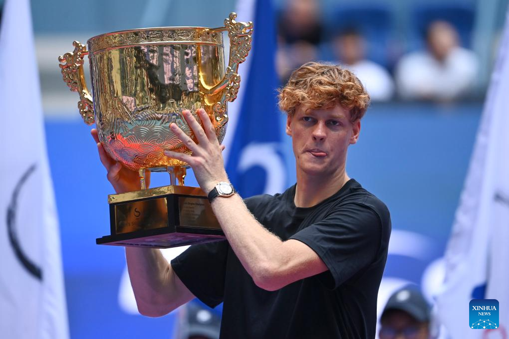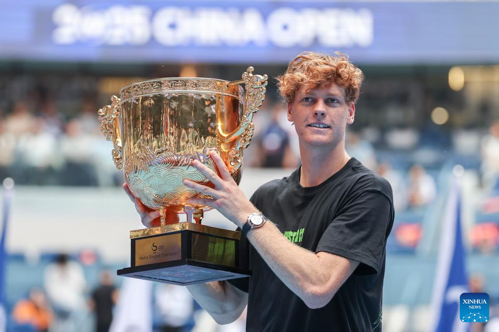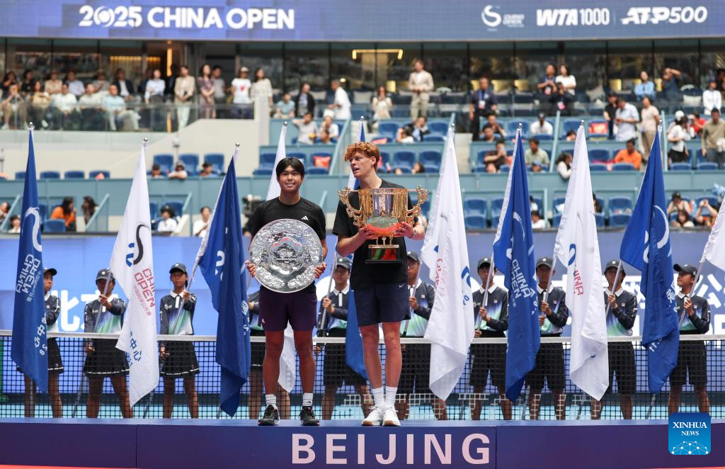 Jannik Sinner poses for photo during the award ceremony for the men's singles final match between Jannik Sinner of Italy and Learner Tien of the United States at 2025 China Open tennis tournament in Beijing, China, Oct. 1, 2025. (Xinhua/Du Xinyi)