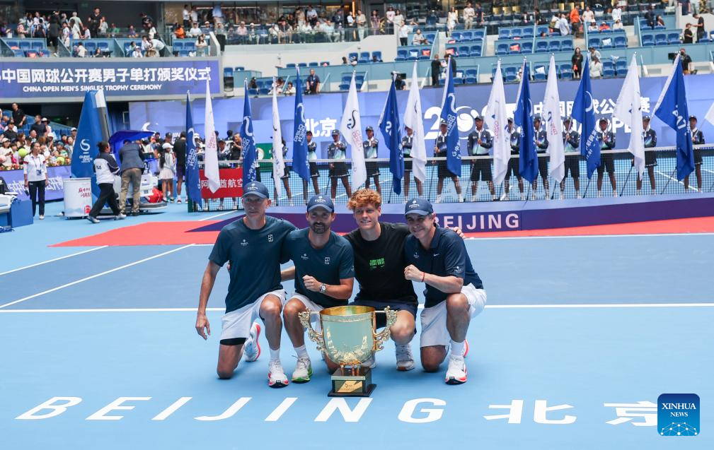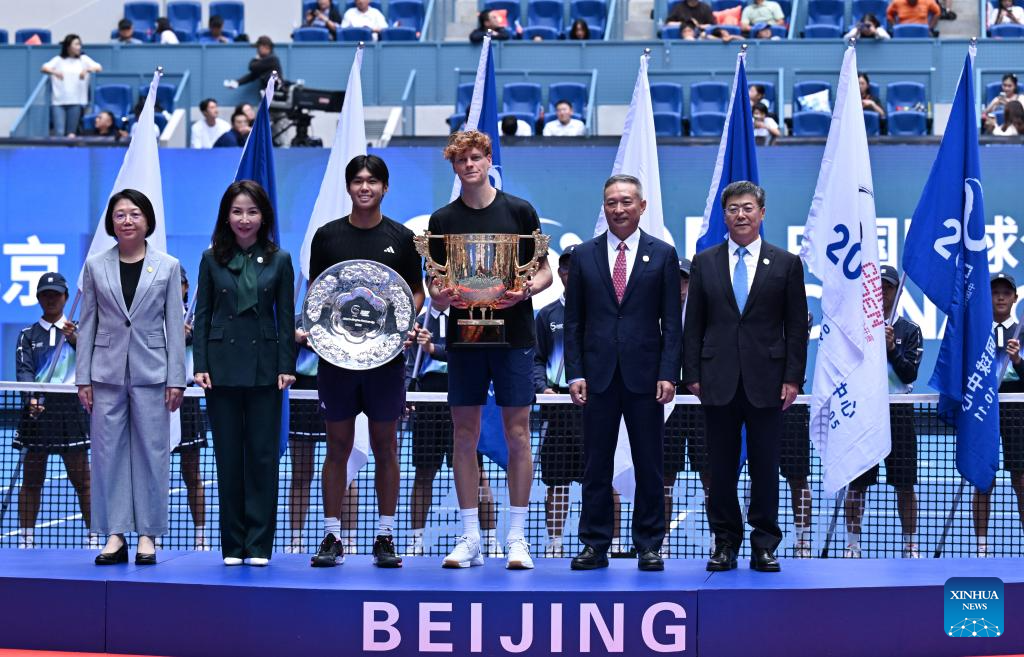 Jannik Sinner (C) poses for photo during the award ceremony for the men's singles final match between Jannik Sinner of Italy and Learner Tien of the United States at 2025 China Open tennis tournament in Beijing, China, Oct. 1, 2025. (Xinhua/Du Xinyi)