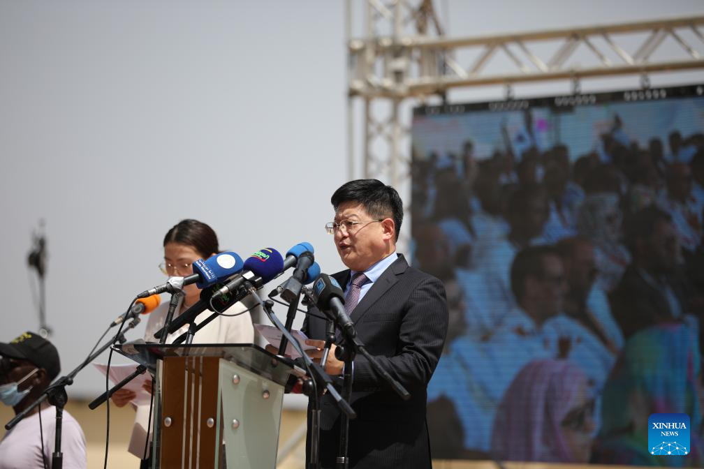 Chinese Ambassador to Mauritania Tang Zhongdong speaks at the inauguration ceremony of the Beni Nadji raw water pre-treatment station project in the Trarza region, Mauritania, Sept. 29, 2025. (Power Construction Corporation of China/Handout via Xinhua)