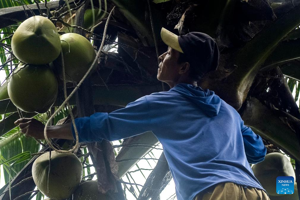 A worker harvests coconuts at a plantation in Bantul regency, Yogyakarta, Indonesia, Sept. 30, 2025. (Photo by Agung Supriyanto/Xinhua)