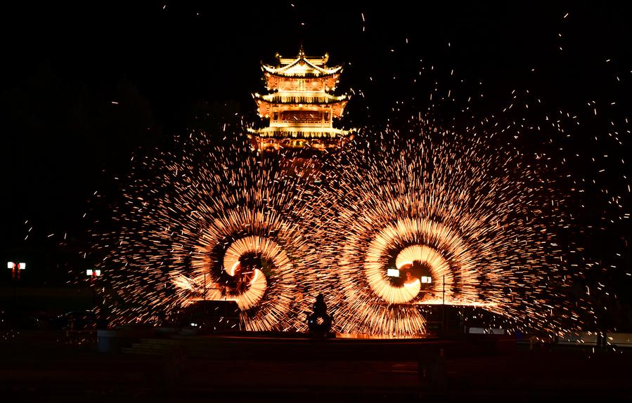 In Shenyang, capital of northeast China's Liaoning Province, the centuries-old art of creating molten iron fireworks along the Puhe River drew many tourists. Originally a northern Chinese ritual to pray for bountiful harvests, national peace and prosperity, it involves throwing molten scrap iron against a cold wall to produce a spectacular firework effect.