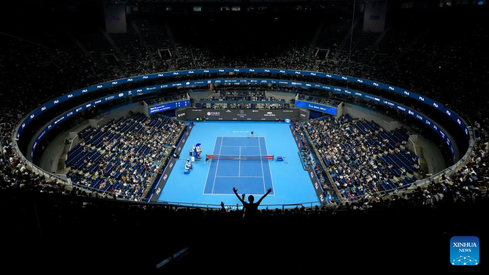 Photo taken on Sept. 30, 2025 shows the men's singles semifinal match between Daniil Medvedev of Russia and Learner Tien of the United States at 2025 China Open tennis tournament in Beijing, China. (Xinhua/Na Yuqi)