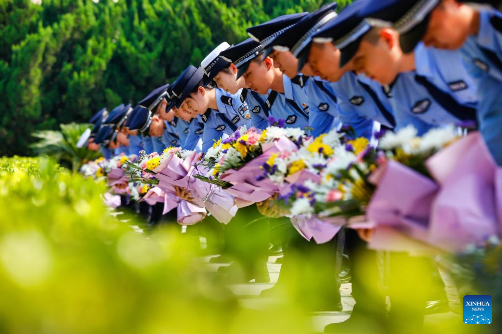 Police officers present flowers to martyrs at a cemetery in Tianjin, north China, Sept. 30, 2025. China observed its 12th Martyrs' Day on Tuesday with commemorations held across the country to honor fallen national heroes. (Photo by Du Penghui/Xinhua)