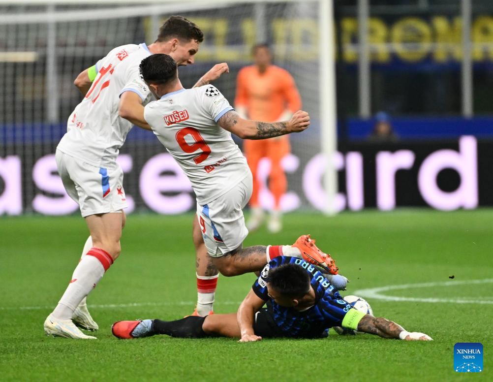 Inter Milan's Lautaro Martinez (bottom) vies with Salvia Praha's Lukas Provod (L) and Vasil Kusej during the UEFA Champions League match between Inter Milan and Slavia Praha in Milan, Italy, Sept.30, 2025. (Xinhua)