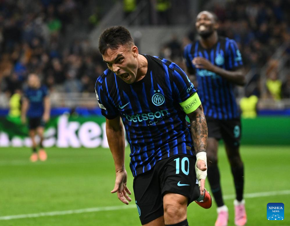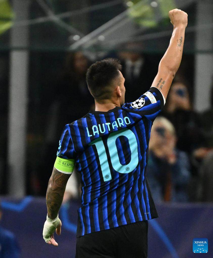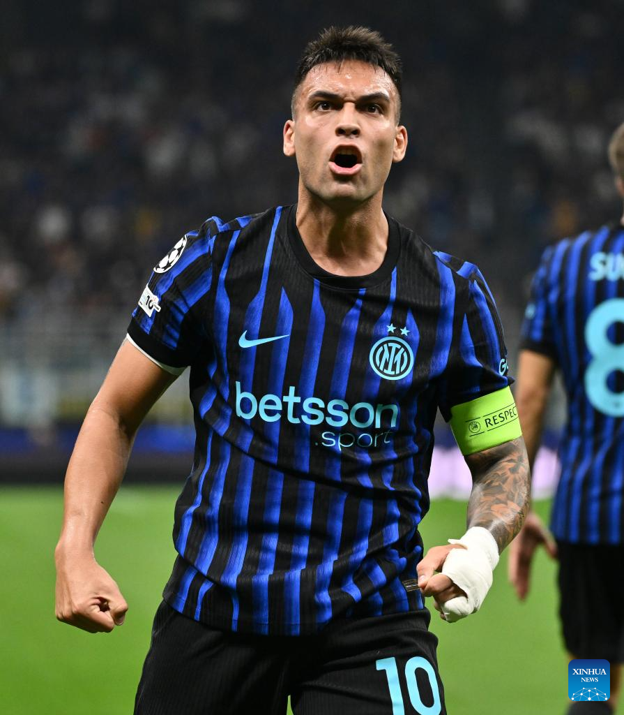 Inter Milan's Lautaro Martinez celebrates his second goal during the UEFA Champions League match between Inter Milan and Slavia Praha in Milan, Italy, Sept.30, 2025. (Xinhua)