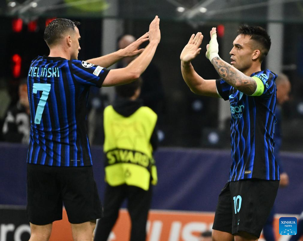 Inter Milan's Lautaro Martinez (R) celebrates his second goal with his teammate Piotr Zielinski during the UEFA Champions League match between Inter Milan and Slavia Praha in Milan, Italy, Sept.30, 2025. (Xinhua)