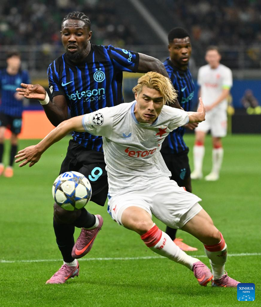 Inter Milan's Marcus Thuram (L) vies with Salvia Praha's Daichi Hashioka during the UEFA Champions League match between Inter Milan and Slavia Praha in Milan, Italy, Sept.30, 2025. (Xinhua)
