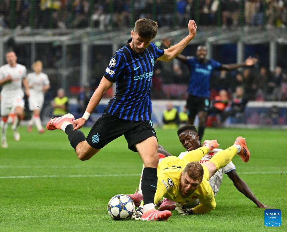 Inter Milan's Alessandro Bastoni (L) vies with Salvia Praha's Christos Zafeiris during the UEFA Champions League match between Inter Milan and Slavia Praha in Milan, Italy, Sept.30, 2025. (Xinhua)