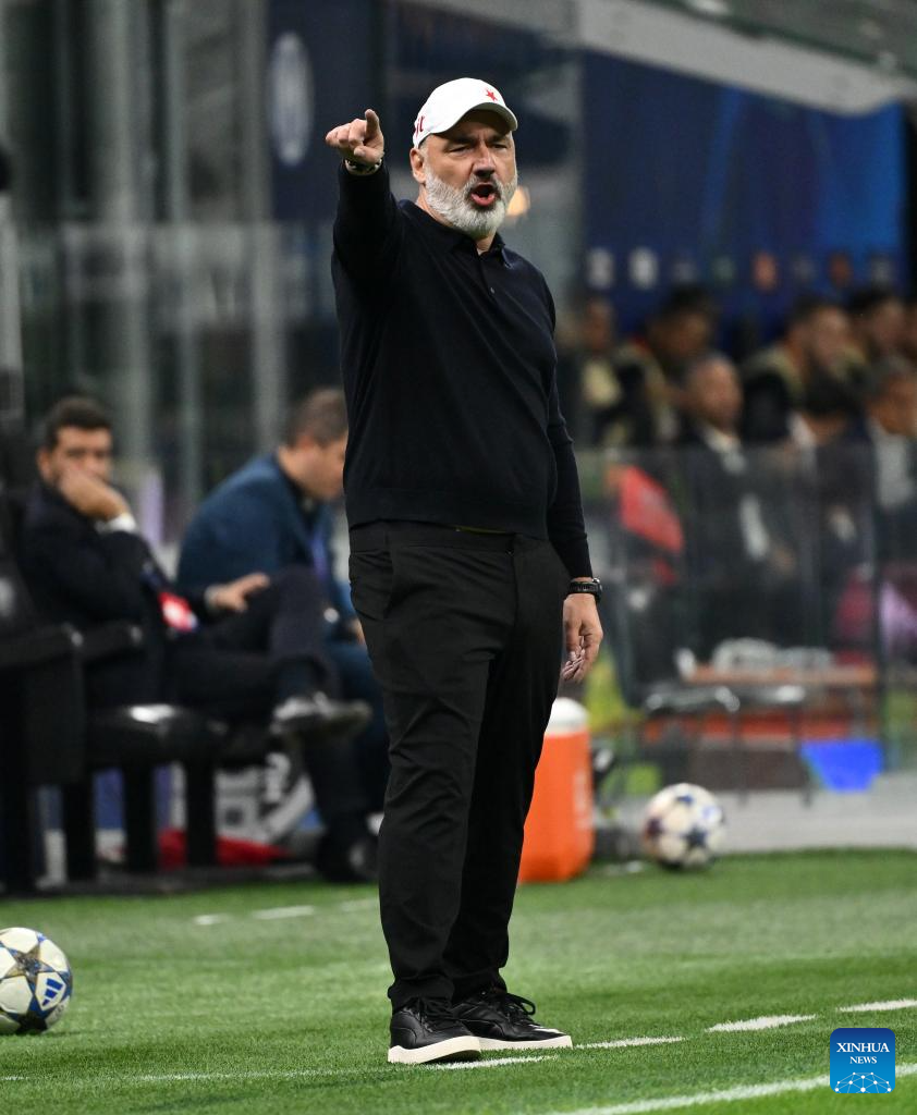 Salvia Praha's head coach Jindrich Trpisovsky gestures during the UEFA Champions League match between Inter Milan and Slavia Praha in Milan, Italy, Sept.30, 2025. (Xinhua)