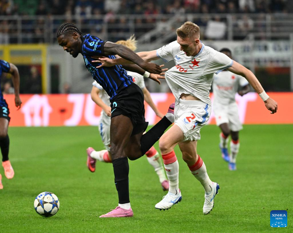 Inter Milan's Petar Sucic (L) vies with Salvia Praha's Jindrich Stanek during the UEFA Champions League match between Inter Milan and Slavia Praha in Milan, Italy, Sept.30, 2025. (Xinhua)