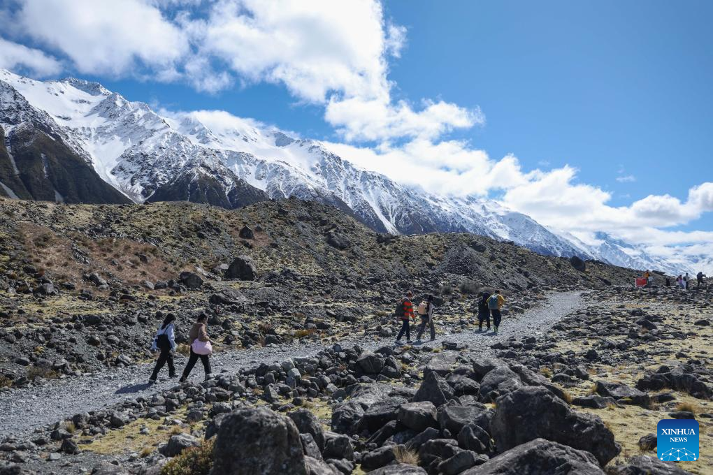People visit Aoraki/Mount Cook National Park in the South Island of New Zealand, Oct. 1, 2025. Integrating a variety of landscapes including snowy mountains, glaciers, and lakes, the Aoraki/Mount Cook National Park draws numerous tourists to visit with its spectacular scenery. (Xinhua/Long Lei)