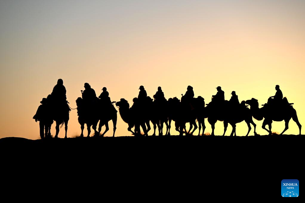 Tourists visit the Mingsha Mountain and Crescent Spring scenic spot in Dunhuang City, northwest China's Gansu Province, Oct. 1, 2025. This year, with China's Mid-Autumn Festival falling alongside National Day, an eight-day holiday starting Wednesday is set to energize local economies through a surge in cultural tourism. (Photo by Zhang Xiaoliang/Xinhua)
