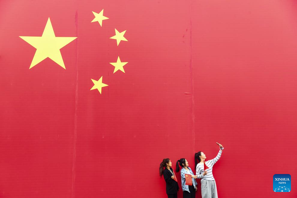 Tourists take photos with a national flag in Jiyuan City, central China's Henan Province, Oct. 1, 2025. The 76th anniversary of the founding of the People's Republic of China was observed on Wednesday in various ways across the country. (Photo by Miao Qiunao/Xinhua)