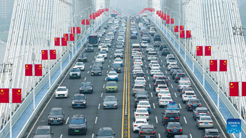 A drone photo taken on Oct. 1, 2025 shows vehicles passing across the Second Yangtze River Bridge in Wuhan, central China's Hubei Province. The transportation network of the country witnessed a travel peak on the first day of the National Day holiday. (Xinhua/Xiao Yijiu)