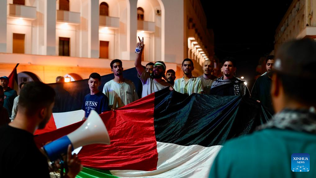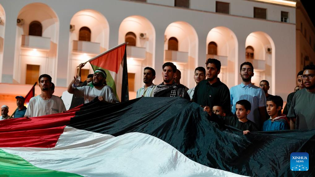 People gather to support the Global Sumud Flotilla (GSF), in central Tripoli, Libya, Oct. 1, 2025. Several vessels of the GSF have been stopped in the Mediterranean Sea as they approached Gaza shores, and their passengers are being transferred to an Israeli port, according to a statement issued by the Israeli Foreign Ministry on Wednesday night.