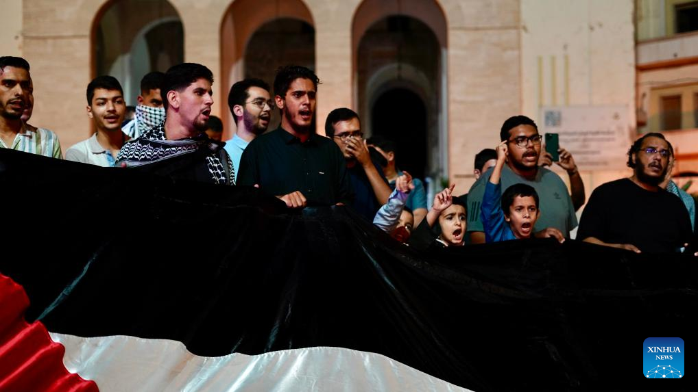 People gather to support the Global Sumud Flotilla (GSF), in central Tripoli, Libya, Oct. 1, 2025. Several vessels of the GSF have been stopped in the Mediterranean Sea as they approached Gaza shores, and their passengers are being transferred to an Israeli port, according to a statement issued by the Israeli Foreign Ministry on Wednesday night. According to the GSF, the international maritime initiative comprises about 50 civilian vessels and more than 500 volunteers from over 40 countries, aiming to challenge Israel's naval blockade on the Gaza Strip and deliver food and medical aid to Palestinians amid the ongoing Israel-Hamas conflict. (Photo by Hazem Turkia/Xinhua)