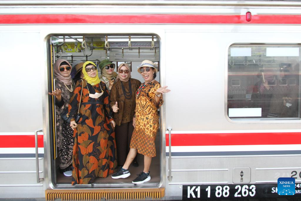 Women wearing batik pose for photos as they take a commuter train in celebration of the National Batik Day in Surakarta, Central Java, Indonesia, Oct. 2, 2025. Indonesia's National Batik Day that falls on Oct. 2 marks the United Nations Educational, Scientific and Cultural Organization (UNESCO)'s recognition on batik as an Indonesian traditional culture. (Photo by Bram Selo/Xinhua)