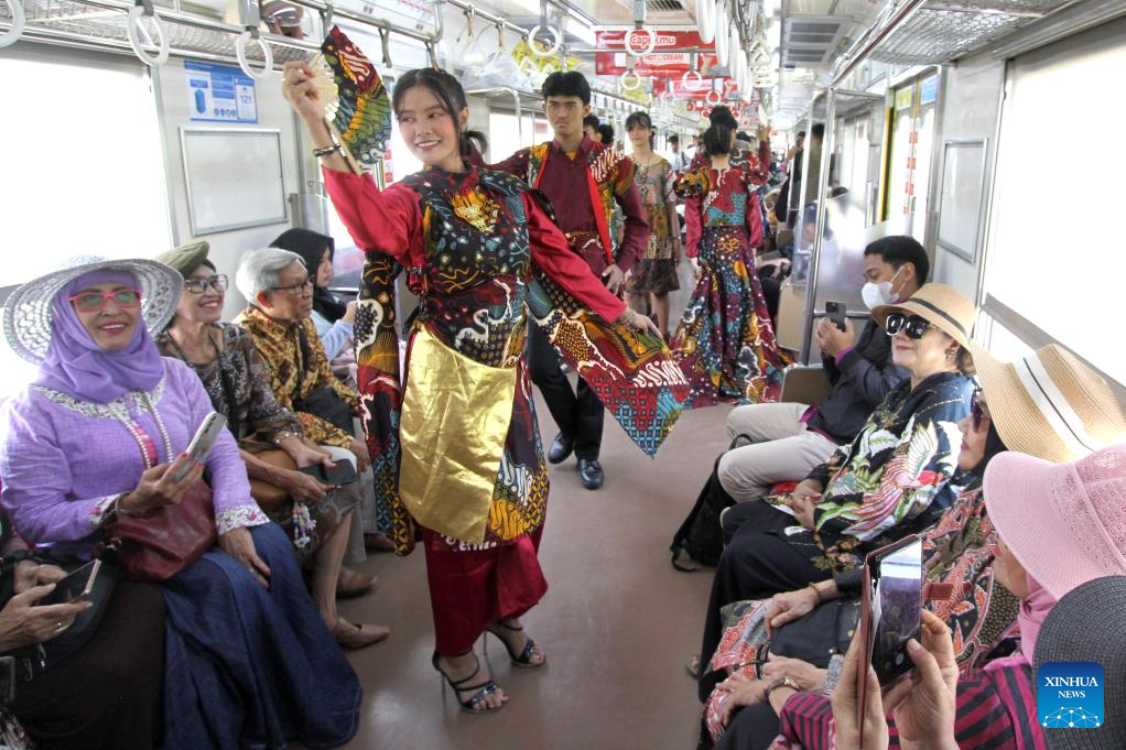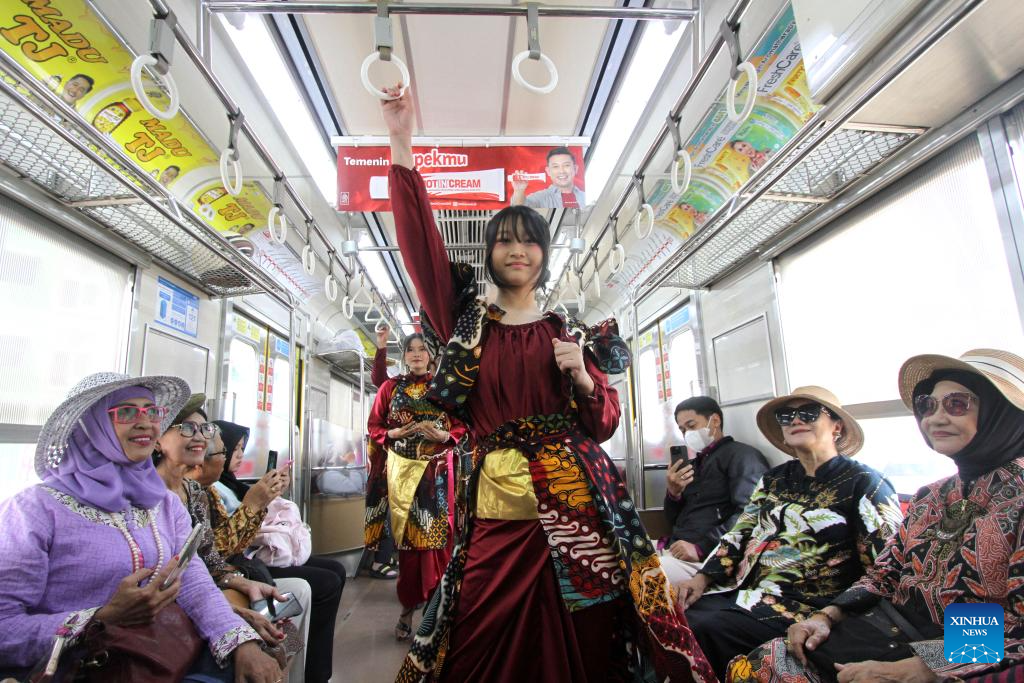 Students wearing batik stage a fashion show in a commuter train in celebration of the National Batik Day in Surakarta, Central Java, Indonesia, Oct. 2, 2025. Indonesia's National Batik Day that falls on Oct. 2 marks the United Nations Educational, Scientific and Cultural Organization (UNESCO)'s recognition on batik as an Indonesian traditional culture. (Photo by Bram Selo/Xinhua)