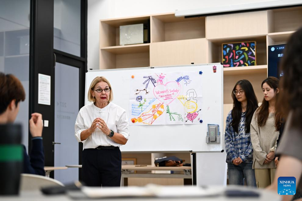 Vitomira Loncar comments on students' presentation on "women's safety" at Xi'an Eurasia University in Xi'an, northwest China's Shaanxi Province, Sept. 25, 2025.(Xinhua/Zou Jingyi)