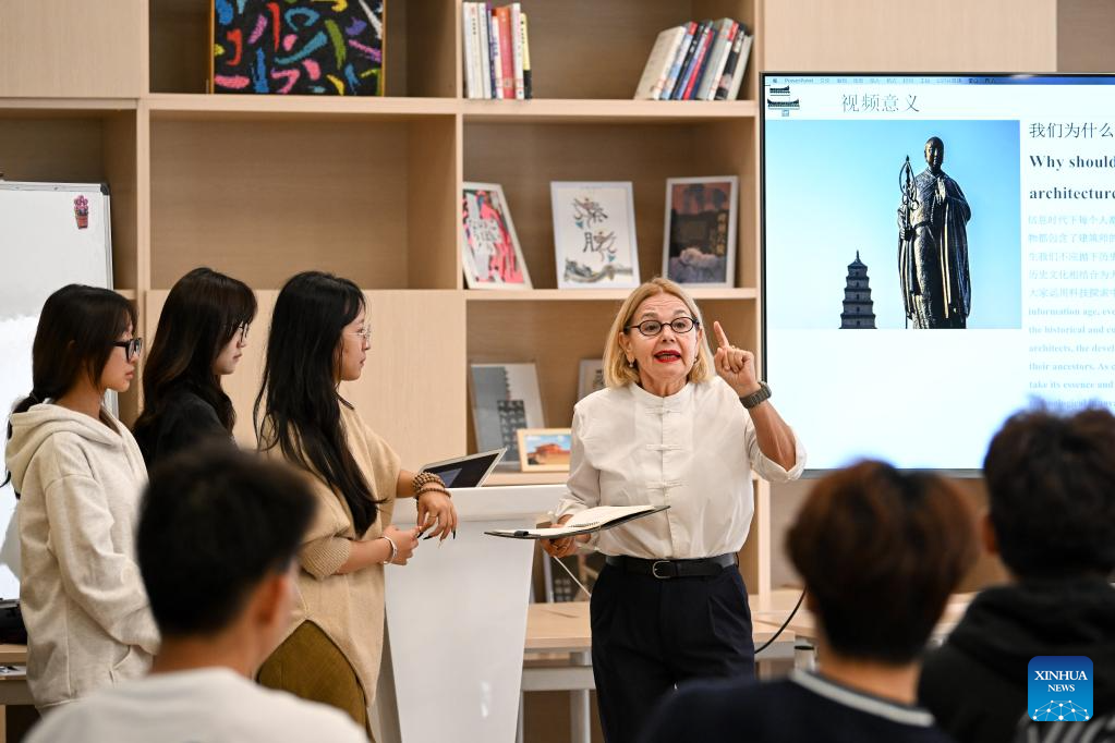 Vitomira Loncar listens to her students' presentations at Xi'an Eurasia University in Xi'an, northwest China's Shaanxi Province, Sept. 25, 2025.(Xinhua/Zou Jingyi)