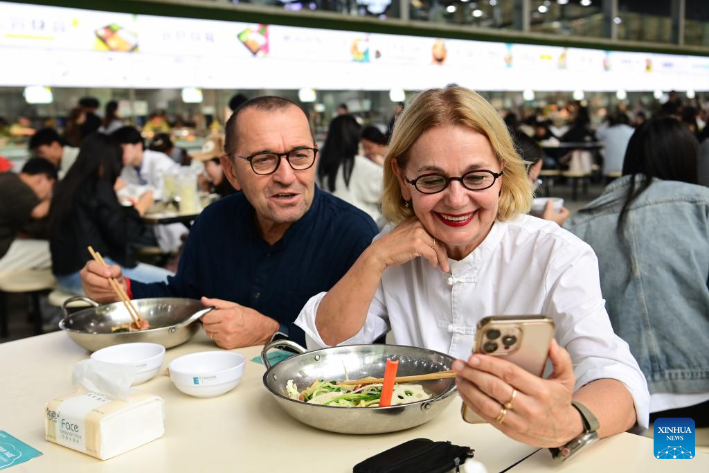 Vitomira Loncar and her husband Ivica Simic watch a video sent by their daughter while having lunch at Xi'an Eurasia University in Xi'an, northwest China's Shaanxi Province, Sept. 25, 2025. Vitomira Loncar is a renowned Croatian playwright, actress, and producer. After retiring in 2016, she chose to move to China with her husband and began teaching courses such as intercultural communication and project management at Xi'an Eurasia University. She transforms dramatic arts into a teaching language, guiding students to understand knowledge and connect with the world through emotion and imagination. Vitomira also established a "Women's Workshop," using drama as a tool to help participants break through self-perception limitations and rebuild confidence and life goals through systematic thematic activities. "We should not be defined," Vitomira said, "and must bravely live as the best version of ourselves." Beyond the classroom, Vitomira also shares her life in China on social media platforms, presenting an authentic and multidimensional China to the world. She described Xi'an as her second hometown, where the profound culture continuously energizes her and supports her work in cultural exchange. (Xinhua/Zou Jingyi)