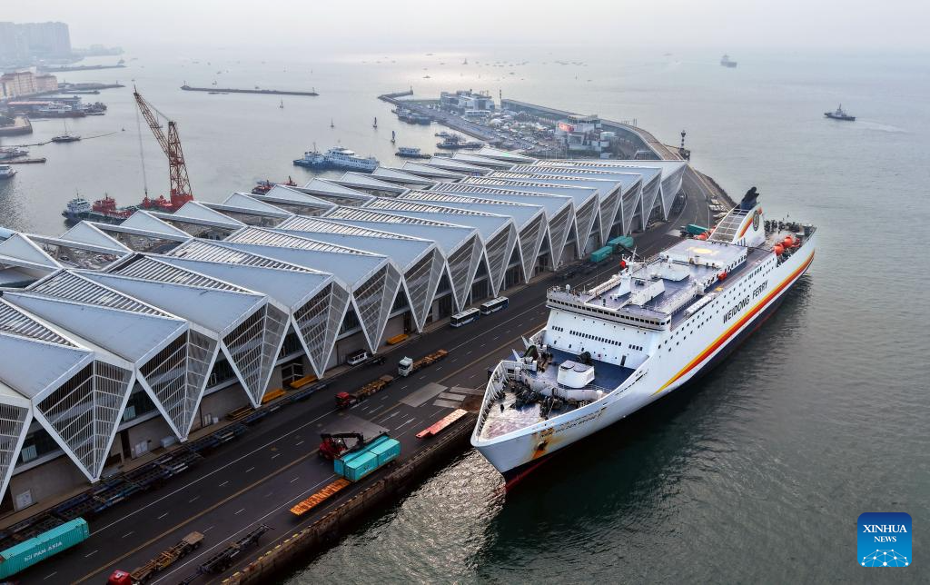 An aerial drone photo taken on Oct. 1, 2025 shows a passenger-cargo liner sailing between Qingdao and Incheon docked at a wharf of the Qingdao Cruise Terminal in Qingdao, east China's Shandong Province. Since South Korea began introducing a temporary visa-free policy for Chinese group tourists on Sept. 29, the number of outbound travelers from Qingdao to South Korea has seen a significant increase. (Xinhua/Li Ziheng)
