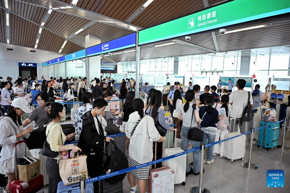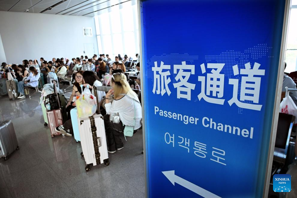 Passengers wait in line to go through exit formalities at the Qingdao Cruise Terminal in Qingdao, east China's Shandong Province, Oct. 1, 2025. Since South Korea began introducing a temporary visa-free policy for Chinese group tourists on Sept. 29, the number of outbound travelers from Qingdao to South Korea has seen a significant increase. (Xinhua/Li Ziheng)