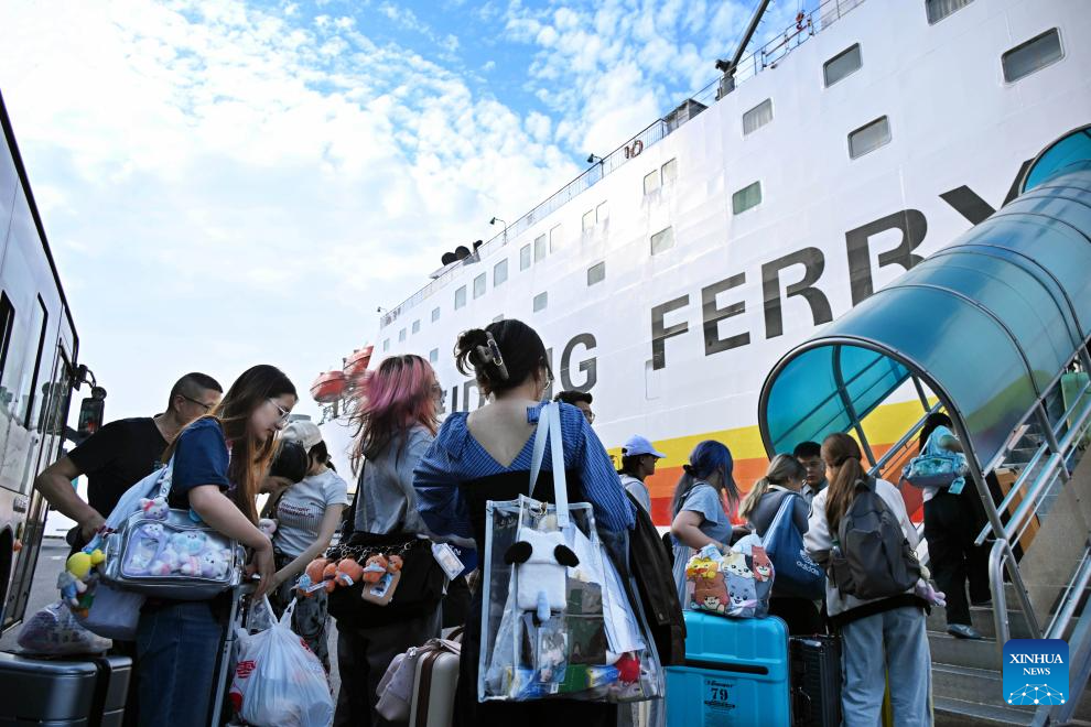 Passengers wait in line to board a passenger-cargo liner at a wharf of the Qingdao Cruise Terminal in Qingdao, east China's Shandong Province, Oct. 1, 2025. Since South Korea began introducing a temporary visa-free policy for Chinese group tourists on Sept. 29, the number of outbound travelers from Qingdao to South Korea has seen a significant increase. (Xinhua/Li Ziheng)