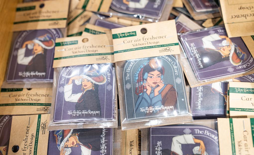 This photo taken on Sept. 29, 2025 shows Tibetan costume-themed car air freshener pieces designed by Yakhore Design Company in Lhasa, southwest China's Xizang Autonomous Region. Tashi Badan, 29, is the founder of Yakhore Design Company in southwest China's Xizang Autonomous Region. In recent years, he has led his team to develop a variety of Tibetan culture-themed products such as decorative items, art pieces and fridge magnets. Describing himself as "a bridge," Tashi Badan promotes products through short videos and live streaming, helping local artists reach a broader audience.