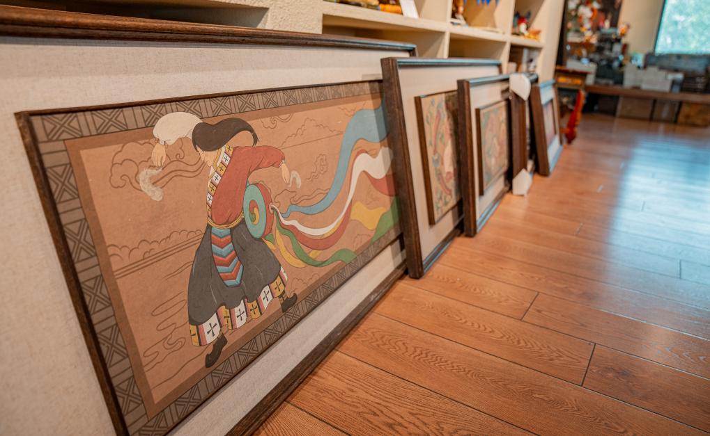 This photo taken on Sept. 16, 2025 shows decorative paintings designed by Yakhore Design Company in Lhasa, southwest China's Xizang Autonomous Region. Tashi Badan, 29, is the founder of Yakhore Design Company in southwest China's Xizang Autonomous Region. In recent years, he has led his team to develop a variety of Tibetan culture-themed products such as decorative items, art pieces and fridge magnets. Describing himself as "a bridge," Tashi Badan promotes products through short videos and live streaming, helping local artists reach a broader audience.