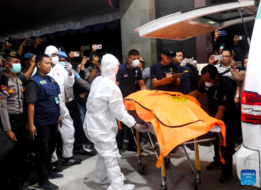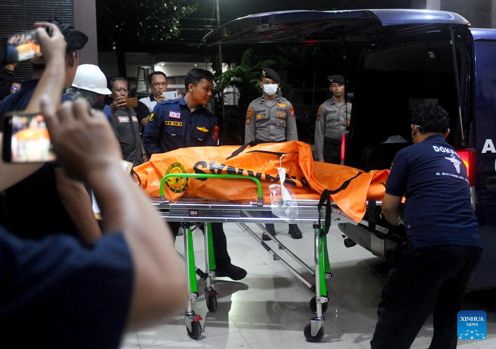 Health workers transfer a body pack of victims of a school building collapse at Bhayangkara Hospital in Surabaya, East Java, Indonesia, Oct. 3, 2025. The death toll from the collapse of a school building in Indonesia's East Java province has risen to eight, a senior rescue official said Friday. Suharyanto, head of the National Disaster Management Agency, said three more bodies were retrieved by rescuers, bringing the fatalities to eight. He said heavy machinery has been deployed in the ongoing excavation, with 55 people still unaccounted for. (Photo by Sahlan Kurniawan/Xinhua)