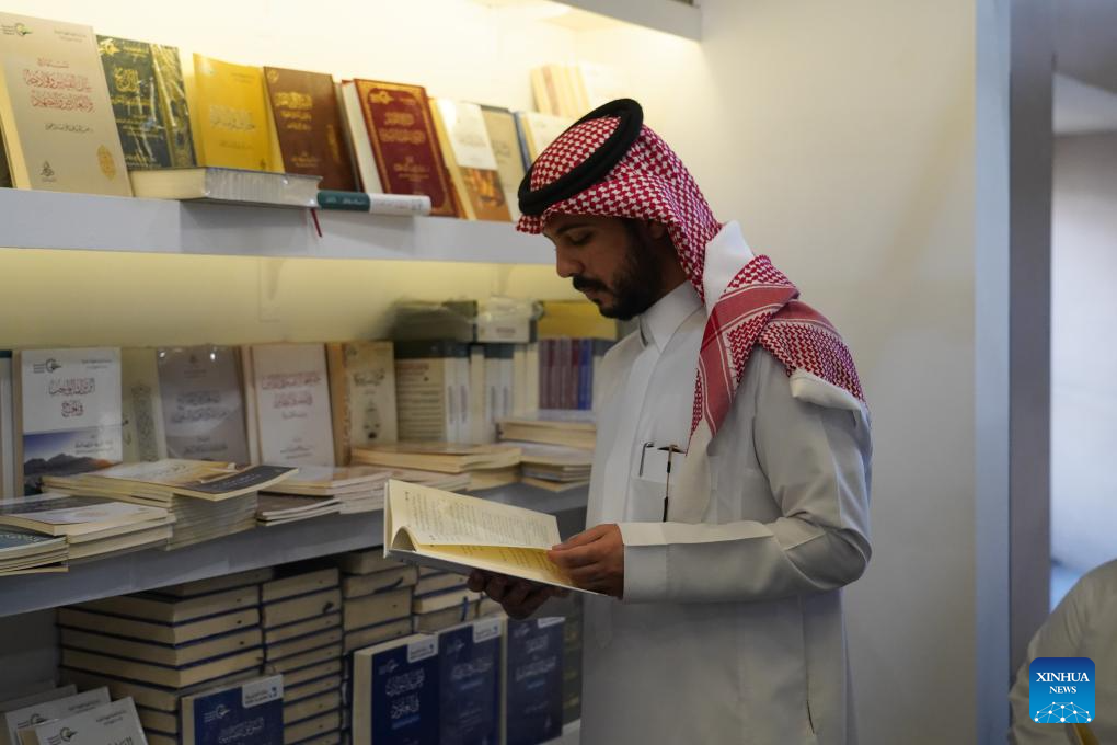 A man reads a book at the Riyadh International Book Fair 2025 in Riyadh, Saudi Arabia, Oct. 2, 2025. The book fair opened here on Thursday, bringing together over 2,000 local and international publishing houses from more than 25 countries, along with a range of cultural institutions. (Xinhua/Luo Chen)