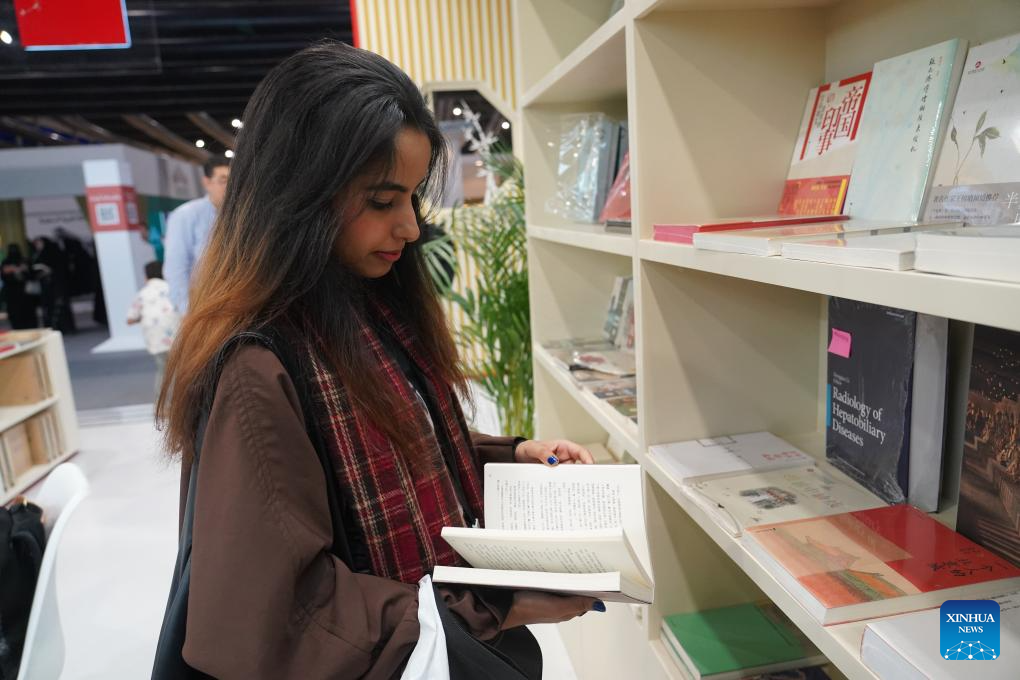 A woman reads a book at the China Pavilion of the Riyadh International Book Fair 2025 in Riyadh, Saudi Arabia, Oct. 2, 2025. The book fair opened here on Thursday, bringing together over 2,000 local and international publishing houses from more than 25 countries, along with a range of cultural institutions. (Xinhua/Luo Chen)