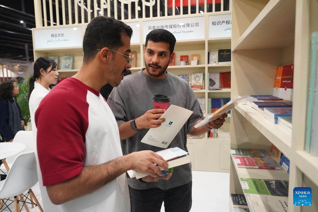 Two men talk at the China Pavilion of the Riyadh International Book Fair 2025 in Riyadh, Saudi Arabia, Oct. 2, 2025. The book fair opened here on Thursday, bringing together over 2,000 local and international publishing houses from more than 25 countries, along with a range of cultural institutions. (Xinhua/Luo Chen)