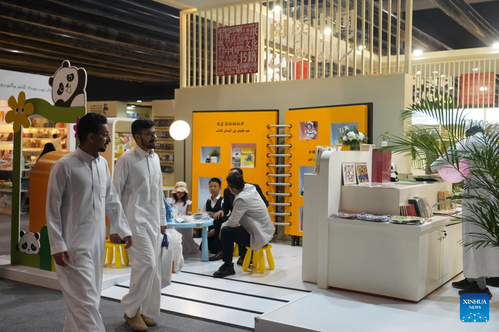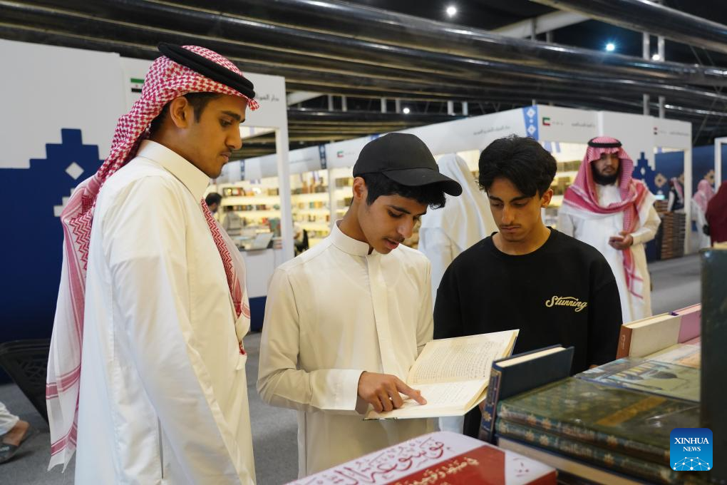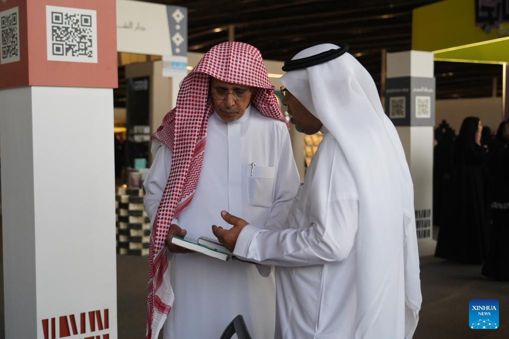 People visit the Riyadh International Book Fair 2025 in Riyadh, Saudi Arabia, Oct. 2, 2025. The book fair opened here on Thursday, bringing together over 2,000 local and international publishing houses from more than 25 countries, along with a range of cultural institutions. (Xinhua/Luo Chen)