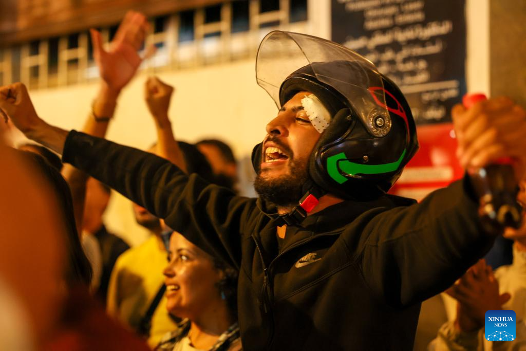 People participate in a protest demanding for better public services in downtown Rabat, Morocco, Oct. 2, 2025. Three people were killed during youth-led protests near Morocco's Atlantic coastal city of Agadir, the Moroccan Interior Ministry said Thursday. Despite the government's pledges, protests that began across Morocco on Saturday have continued. Protesters have demanded major reforms in education and healthcare, criticizing the government for prioritizing spending on international sporting events such as the 2030 FIFA World Cup and the 2025 Africa Cup of Nations instead of improving public services. (Xinhua/Huo Jing)