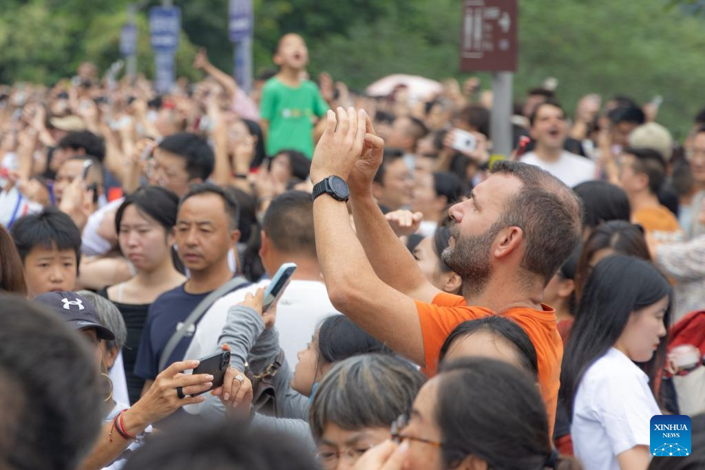 A Serbian tourist has fun at the viewing platform around the Liziba Station of Chongqing Rail Transit in Yuzhong District of southwest China's Chongqing, Oct. 3, 2025.