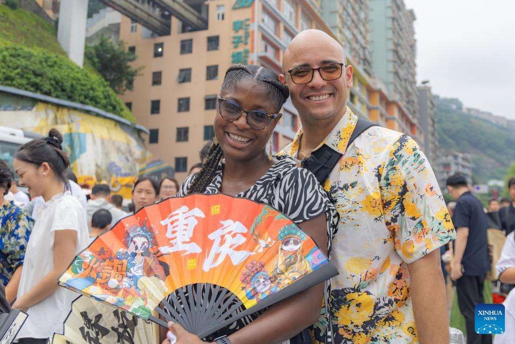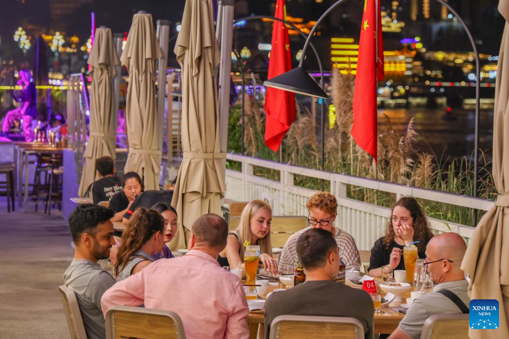 Foreign tourists enjoy the night in Nan'an District of southwest China's Chongqing, Sept. 30, 2025.