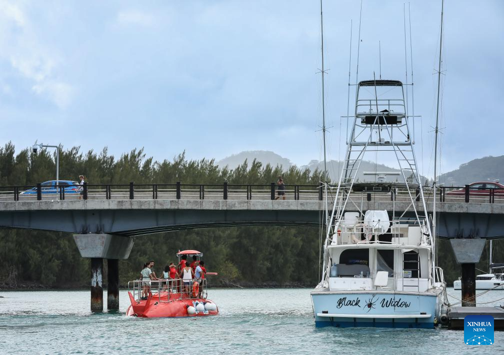 Tourists take a sightseeing submarine on Mahe Island, Seychelles, on Sept. 26, 2025. Seychelles is an Indian Ocean archipelago comprising 115 islands. Mahe Island, the largest among all islands of the nation, is home to the capital city Victoria and a renowned tourist destination. (Xinhua/Han Xu)
