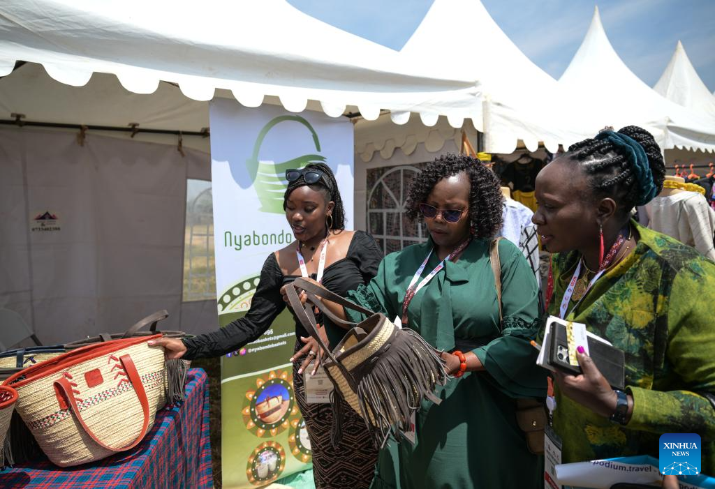 Visitors view hand-woven tote bags made from eco-friendly materials at the 15th edition of the Magical Kenya Travel Expo in Nairobi, Kenya, Oct. 2, 2025. Kenya is hosting the three-day expo, running until Friday, which has attracted 6,500 delegates from 40 countries, including tourism ministers, city mayors, investors, travel enthusiasts, and promoters. (Xinhua/Yang Guang)