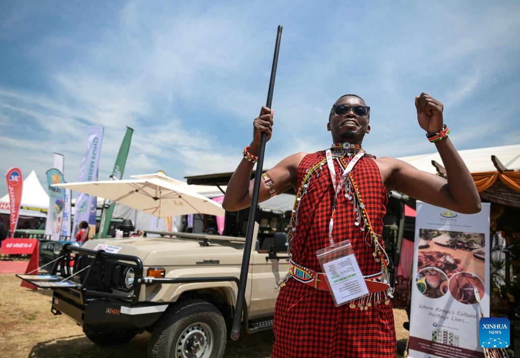 A Maasai man dances in front of an open-top safari vehicle to attract visitors at the 15th edition of the Magical Kenya Travel Expo in Nairobi, Kenya, Oct. 2, 2025. Kenya is hosting the three-day expo, running until Friday, which has attracted 6,500 delegates from 40 countries, including tourism ministers, city mayors, investors, travel enthusiasts, and promoters. (Xinhua/Yang Guang)