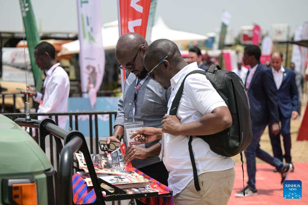 Visitors view information at the booth of a safari vehicle modification manufacturer during the 15th edition of the Magical Kenya Travel Expo in Nairobi, Kenya, Oct. 2, 2025. Kenya is hosting the three-day expo, running until Friday, which has attracted 6,500 delegates from 40 countries, including tourism ministers, city mayors, investors, travel enthusiasts, and promoters. (Xinhua/Yang Guang)